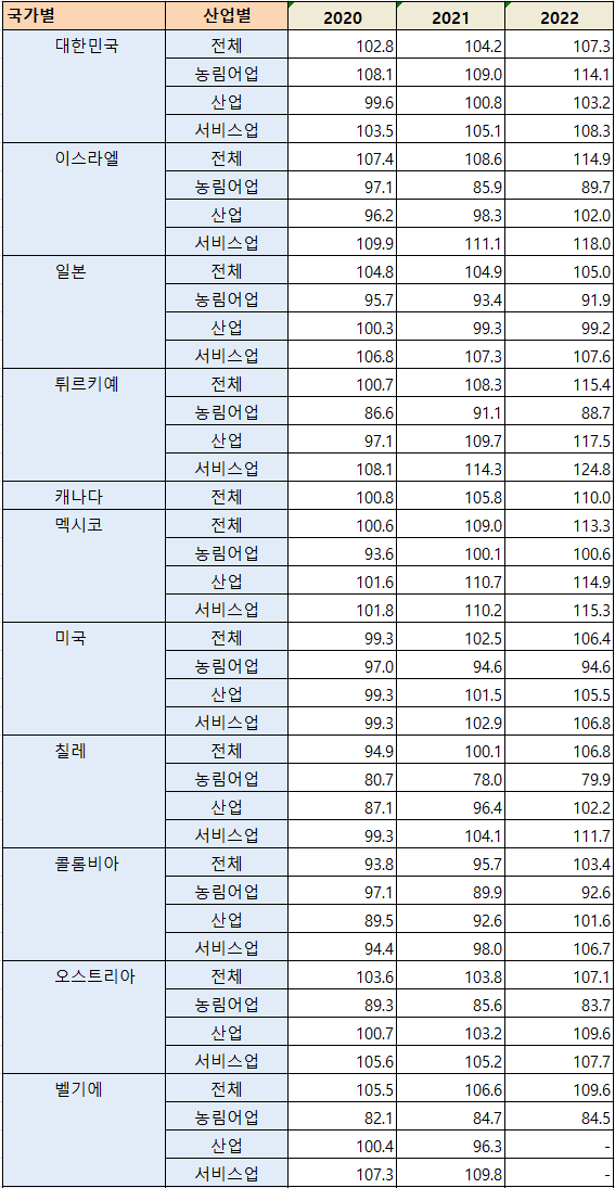 | 근로자당 연평균 실제 근로시간(OECD회원국) (1) | 2023.11.21 |