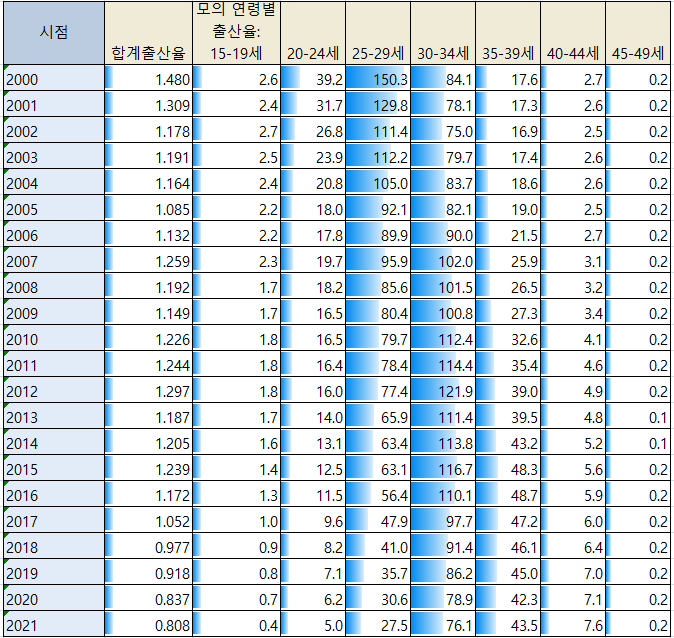 | 합계 출산율 | 출생아수(년) | 모의 평균 출산 연령 |