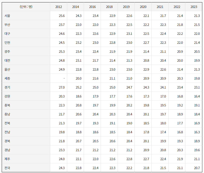 우리나라 학급당 초등학생 수